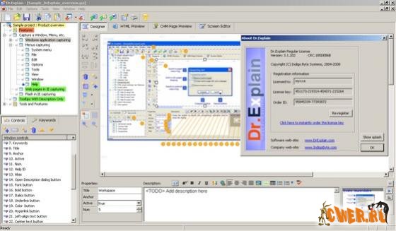 Dr.Explain – продукт одним словом новый в своем стиле. Программа автоматически обращается со структурой окна и добавляет объяснительную документацию ко всем средствам управления окна. Dr.Explain захватывает окна прямо с вашего живого окна, создает скриншоты и автоматически добавляет ссылки на средства управления всего окна: кнопки, редактируемые области, радио-кнопки, dropdown списки, и другие элементы. На профессиональном уровне просматривает такие файлы как Dr.Explain CHM, RTF или HTML. Так же делает экспорт ваших проектов в HTML, CHM, или RTF файлы включая скриншоты, цвет, меню, и index страницу.
