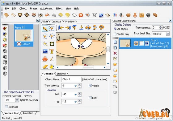 С помощью этой программы вы сможете быстро и легко создавать качественную анимацию. В новой версии программы встроено множество мощных инструментов для редактирования визуальных стилей. EximiousSoft GIF Creator обеспечивает множество текстовых эффектов для производства текстовых банеров. Не только анимация может быть сохранена как анимация GIF, но также фрэймы могут экспортироваться из SWF, AVI, PSD, ANI, ICO, CUR файлов.