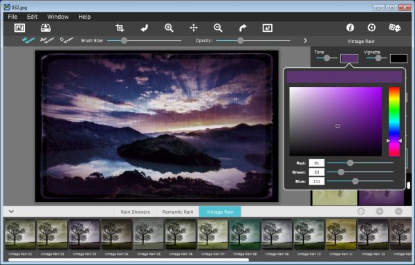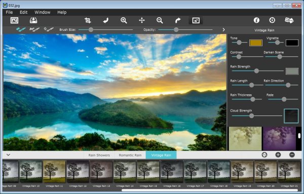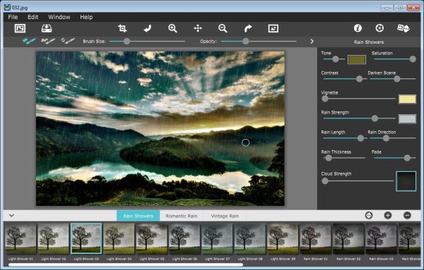 Rainy Daze - программа, которая позволит создать на фото настроение дождливого, пасмурного дня (драматичность в кадре, капли воды), а также добавит дождь на Ваши фотографии. В программе присутствуют три стиля, которые легко настроить (к примеру, мелкий дождь превратить в ливень или изменить наклон дождя и т.д.)