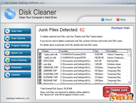 Программа предназначена для очистки ненужных файлов с вашего диска. Способна автоматически искать и удалять "мёртвый груз" в стандартных местах его нахождения, тем самым избавляя от возможных проблем с нехваткой места на жестком диске. Программа проста и удобна в применении - файлы могут отправляться в корзину вместо полного удаления.