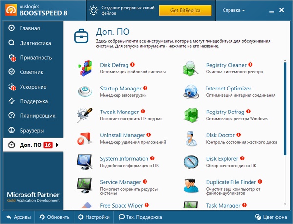 - Удобная навигация. Aбсолютно новый интерфейс BoostSpeed 6 позволяет легко управлять программой. Все утилиты и функции быстро доступны. Основные задачи - очистка дисков, исправление ошибок в реестре, а также дефрагментация файлов могут быть выполнены с помощью всего нескольких кликов мышки! Программа отображает текущее состояние компьютера и, в случае необходимости, предлагает выполнить проверку системы.