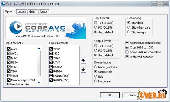 Новая версия H.264 видео кодека разработанного CoreCodec. Кодек CoreAVC базируется на MPEG-4 ч.10 стандарте, и является одним из кодеков используемых в Blu-ray (BD) и в High Definition DVD (HD-DVD). AVC/H.264 - стандарт следующего поколения видео и CoreAVC признаётся одним из лучших и эффективных декодеров H.264. Эффективность CoreAVC заключается в программном подходе к декодированию, он не полагается на аппаратные средсва ПК для увеличения производительности при воспроизведении H.264 видео в отличии от других решений подобного рода. Имеется поддержка деинтерлейсинга на программном уровне.