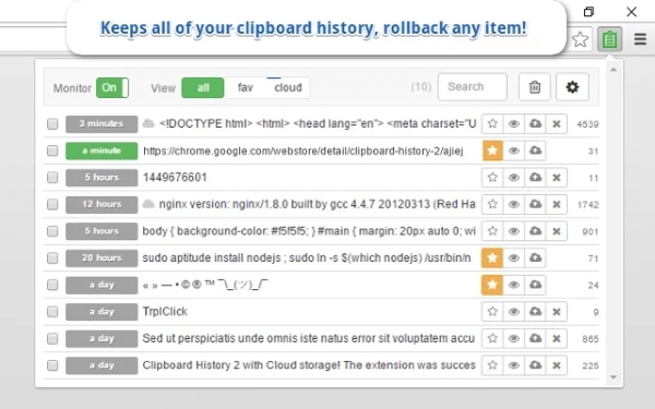 Clipboard History 2 наблюдает за буфером обмена и хранит историю всего текста, который пользователь копировал. Под мониторинг попадает текст, который был скопирован как в Google Chrome, так и в сторонних программах: достаточно держать открытым браузер со включенным расширением.