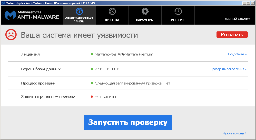 Компьютер находится под постоянной угрозой различных типов вредоносного ПО (вирусы, черви, трояны, руткиты, spyware-программы и т.д.), непрерывно развивающихся. Поэтому необходимы самые эффективные методы, которые смогут держать Ваш компьютер в полной безопасности. В этом Вам поможет антивирусная программа Malwarebytes Anti-Malware предназначенная для быстрого сканирования системы в поисках различных видов вредоносного ПО и лечения самых сложных заражений.