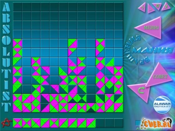Логическая игра, которая представляет интерес для настоящих поклонников головоломок. Впереди вас ждет множество непростых задачек, которые можно решать в любом из 3 игровых режимов. На игровом поле располагется множество квадратов, состоящих из разноцветных треугольников. При помощи мышки поворачиваете квадраты таким образом, чтобы в итоге соединить как минимум 4 треугольника одного цвета в фигурку произвольной формы.