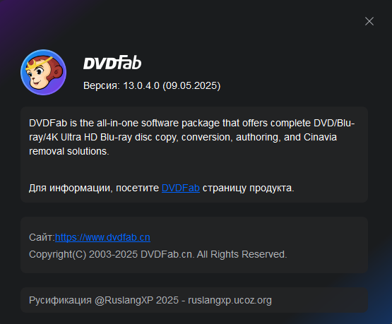 DVDFab – мощный, многофункциональный программный продукт для копирования DVD дисков с возможностями гибкой обработки видеопотока. Программа является одной из лучших на сегодняшний день, из инструментов для копирования, разбиения, пережатия и конвертирования DVD дисков с фильмами. Снимает все защиты и ограничения с диска и при желании пережмет диск большой емкости и вместит его в обыкновенную пустую DVD болванку с минимальными потерями качества (DVD9->DVD5) или разобьет фильм на два диска с полным переносом его меню, удалит всю рекламу, запишет только фильм и многое другое. Программа имеет интуитивно понятный, мультиязычный интерфейс включая русский.