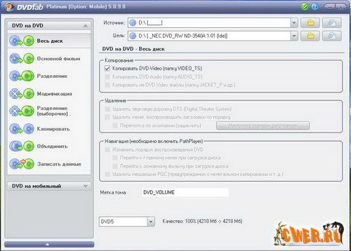 При копировании DVD можно выбрать один из нескольких режимов: полное копирование, копирование только основного фильма, выбор порядка воспроизведения клипов. Программа поддерживает и многие виды защиты, такие как CSS, RC, RCE, APS, UOPs, ARccOS, RipGuard, FluxDVD, CORE X2.