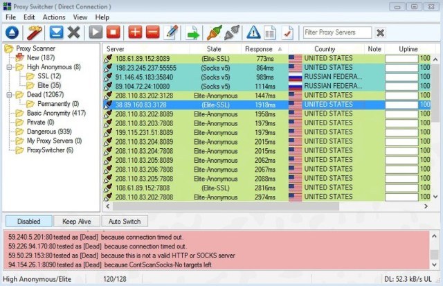 Переключение между доступными прокси-серверами будет происходить автоматически через установленные вами промежутки времени. Используя Proxy Switcher вы сможете посещать любые web ресурсы не опасаясь несанкционированного сохранения ваших данных. Вы можете быть уверены, что ваши данные не попадут в спам-листы, что ваш IP адрес, операционная система и интернет браузер не будут определены.