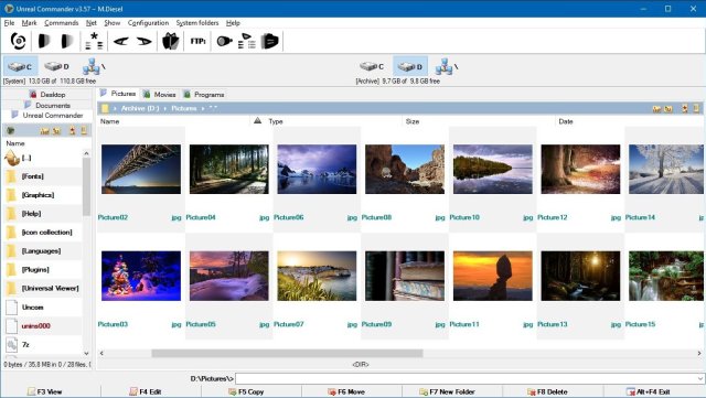 Из функций стоит отметить удобную систему поиска, полную поддержку UNICODE, можно переименовывать как файлы так и папки в групповом режиме, есть режим синхронизации каталогов, можно работать с архивами разных форматов, имеется достаточно неплохой FTP клиент, реализована поддержка как WLX так и WСX плагинов, есть вьюер для быстрого просмотра графики, Unreal Commander может работать с вашими сетевыми окружениями, добавлять файлы можно просто перенеся их в главное окно, можно создавать избранное, открывать закладки и так далее.