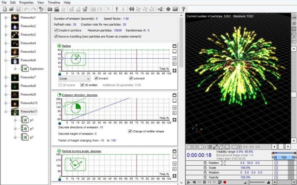 - Появилась возможность ограничивать область рождения новых частиц. Например, можно создать эмиттер огня на большой площади, а затем ограничить эту площадь небольшой сферой по центру. Тогда новые частицы будут рождаться лишь в пределах этой сферы. Но у сферы можно постепенно увеличивать радиус, что практически даст эффект "расползания" пламени.