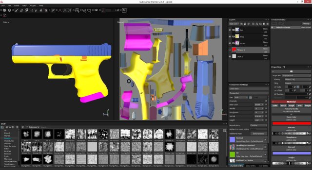 Пользователь может изменить разрешение любое время, а Substance Painter практически сразу будет пересчитывать каждый штрих. Переключите свой набор UV и штрихи будут автоматически перепроецированы (для рисования не обязательно иметь идеальный набор UV!). - Библиотека материалов