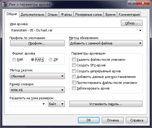 • WinRAR и RAR для командной строки по умолчанию используют формат архивов RAR 5.0. Вы можете изменить его на формат, совместимый с RAR 4.x, выбрав параметр "RAR4" в окне архивирования или указав ключ -ma4 в командной строке. Если нужно, чтобы по умолчанию использовался формат RAR 4.x, то в настройках WinRAR на вкладке "Архивация" нажмите кнопку "Создать профиль по умолчанию..." и выберите в появившемся окне параметр "RAR4". Это изменение относится к случаю, когда программа устанавливается в компьютере впервые. Если вы уже сохраняли формат RAR в профиле архивации по умолчанию в предыдущих версиях, то WinRAR учитывает сохранённые настройки.