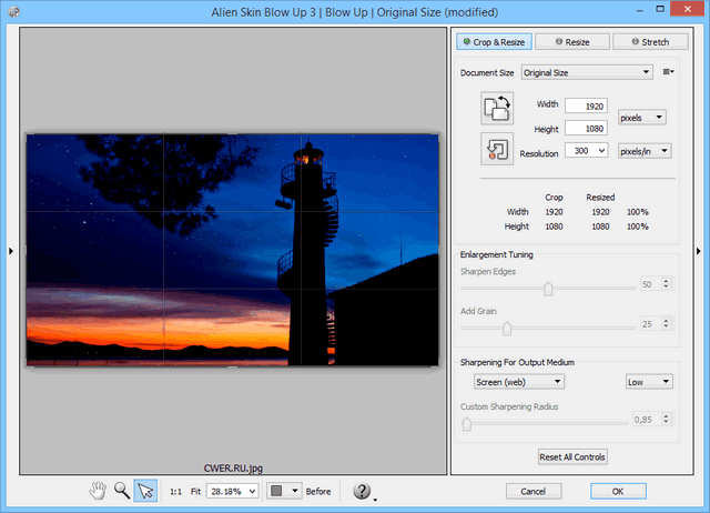 Blow Up - плагин предназначен для увеличения размеров изображений с максимальным сохранением их качества. В отличие от других решений для увеличения, Blow Up может масштабировать картинки до 3600 % (в шесть раз в каждом измерении), и при этом на них не появляются такие артефакты, как эффект расчески, ореол и разводы. Blow Up может работать в режимах CMYK, RGB, Lab, Grayscale, и Duotone, справляется с обработкой файлов, которые содержат несколько слоев (при этом сводить их не нужно) и работает с 16- и 32-битными изображениями, в том числе RAW и HDR. Еще одна возможность плагина - сохранение нового изображения в виде отдельного файла, когда исходная картинка остается нетронутой.