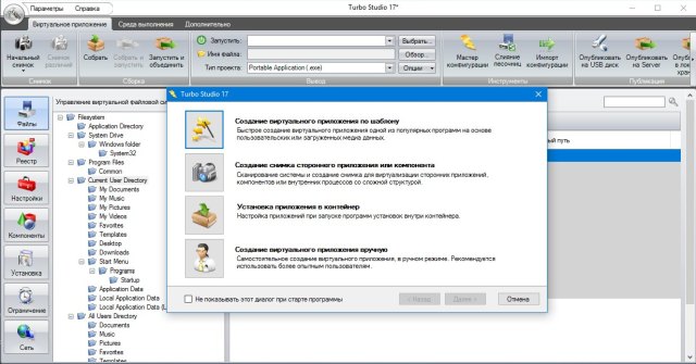 Сканирование системы и создание снимка для виртуализации сторонних приложений, компонентов или внутренних процессов со сложной структурой. Мгновенные снимки фиксируют состояние системы до и после установки приложения, Turbo Studio автоматически настраивает параметры виртуального приложения на основе наблюдаемых изменений системы. - Создание виртуального приложения вручную