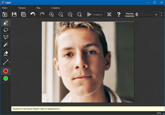 - Выделить нежелательный объект с помощью инструмента Маркер, размер которого вы можете легко изменять с помощью ползунка от 1 до 100. Просто закрасьте маркером объект который вы хотите удалить