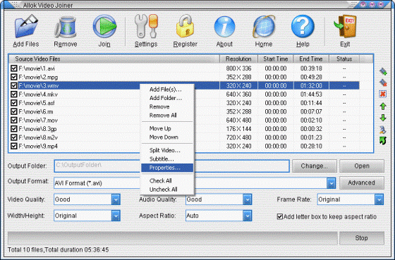 Allok Video Joiner is a powerful tool to join or merge multiple AVI, Divx, XviD, MPEG, WMV, ASF, RM, MOV, 3GP, MP4, FLV files into one large file in various format.