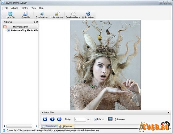 Электронный фотоальбом с функцией защиты от посторонних глаз. Пользователь загружает в программу фотографии и задаёт пароль, после чего снимки можно просмотреть только с помощью Private Photo Album. Для качественной защиты, все изображения хранятся в одном файле, доступ к которому имеет только данная утилита. Возможна работа с изображениями форматов JPEG, BMP, PNG, GIF, PCX, TIFF. Private Photo Album использует 256-битное шифрование, позволяет задавать пароли длиной до 16 символов.