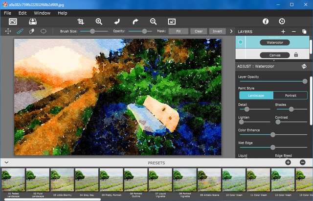Watercolor Studio - графический редактор для создания естественных, полупрозрачных акварельных эффектов. Программа моментально создает из вашего изображения акварельную картину, а затем позволяет настроить и применить эффекты при помощи набора слайдеров, кистей, слоев, цветовых шаблонов и художественной отделки. И в результате вы получите качественные акварельные краски, наполненные прозрачной и естественной красотой.