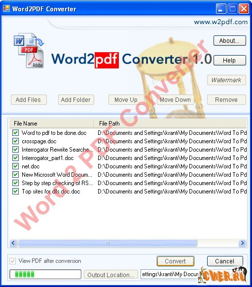 Создавайте PDF на лету! Word2PDF Converter разработан для решения потребности в конвертировании Microsoft Word(.doc) файлов в PDF формат. Основные особенности включают в себя: пакетная конвертация множества файлов; наложение в виде защиты авторства простого и полупрозрачного текста или "водяных штампов" в виде изображений под любым углом и любых размеров; Metadata для PDF документов и добавление Цифровой Подписи и т.д., как, Вам нравится. Чрезвычайно легкий удобный в пользовании интерфейс и приличная скорость конвертации, при отсутствии какой либо потери в качестве.