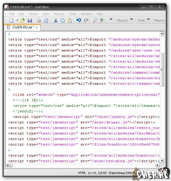 EmEditor Professional - профессиональная версия мощного текстового редактора для программистов, веб-разработчиков и простых пользователей с подсветой синтаксиса и поддержкой юникода. Редактор обладает такими функциями, как поиск и замена в файлах с использованием регулярных выражений, автоопределением кодировок, подсветка ссылок и адресов электронной почты, блочный режим выделения, настройка панели кнопок, меню, шрифта и цвета элементов. Для каждого языка можно создавать отдельную конфигурацию. Также программа имеет поддержку мощных макросов написанных на JavaScript или VBScript, позволяющих создавать практически любые действия, используемые часто или периодически. Этот редактор является идеальным средством для редактирования HTML, PHP, JSP и XML файлов. При указании интернет-браузера в качестве внешнего приложения, вы сможете просматривать HTML файлы во время редактирования.