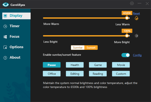 Слишком яркий или слишком темный экран может вызвать раздражение глаз. CareUEyes автоматически регулирует яркость экрана примерно так же, как яркость вокруг вас. CareUEyes регулирует яркость без PWM, избегая проблем с мерцанием.