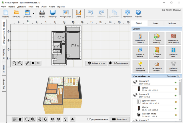 Дизайн Интерьера 3D - это удобная программа для перепланировки и создания дизайн-проекта квартиры своими руками. Позволяет сэкономить до 30% времени и денег при ремонте: вы будете точно представлять облик всех комнат после ремонта, сможете удачно расставить мебель и технику. Продукт включает более 120 встроенных материалов отделки (различные виды обоев, ламинат, паркет, линолеум, плитка и т.п.)