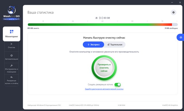 Abelssoft WashAndGo — эта программа позволяет пользователям легко и просто очистить жесткий диск компьютера, освобождая место на диске и ускоряя доступ к важным данным. Программа быстрая, безопасная и надежная. WashAndGo удаляет мусорные файлы, которые заполняют жесткий диск и ничего не делают, кроме замедления компьютера. Мусорные файлы, которые могут быть удалены WashAndGo включают временные файлы которые не удаляются, когда программы закрыты, копии старых файлов безопасности, которые создаются автоматически с помощью некоторых программ, файлы без реального содержания и др.
