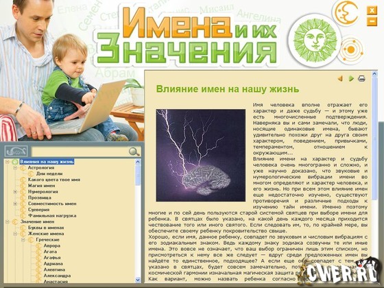 Научно доказано, что звуковые и нумерологические вибрации имени во многом определяют и характер человека, и его жизнь. Что означает то или иное имя и каково его происхождение, какое имя больше подойдет вашему ребенку, какие звезды и планеты влияют на обладателей разных имен, когда ваш день ангела и какое число соответствует вашему имени – эта и другая информация об именах и их влиянии на жизнь собрана на одном диске! Благодаря данной энциклопедии вы также узнаете, как образуются имена у разных народов мира, каковы тенденции моды в этой области, почему 40 % вьетнамцев однофамильцы, какое полное имя у Пикассо и многое другое. В разделе «Это любопытно» вы найдете занятные факты о самых странных и самых длинных именах. Узнайте больше о себе и своем имени!