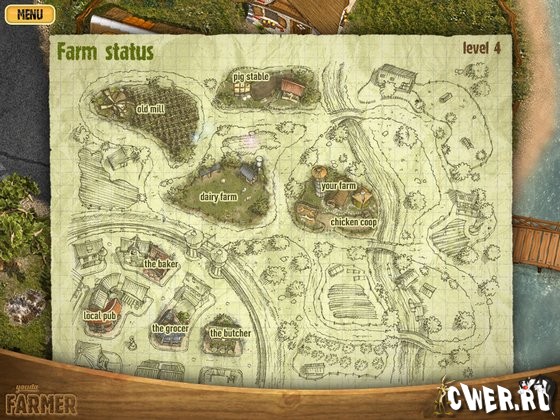 Эта новая очень красочная игра научит вас всем премудростям ведения фермерского хозяйства. Вам предстоит начать с небольшой фермы, производящей муку для сельской пекарни. По мере роста, вы сможете модернизировать вашу ферму - построить конюшню, курятник, завести свиней и овец... Выращивать помидоры, картофель, виноград и ещё многое другое. Вам придётся трудиться не покладая рук, чтобы вовремя обеспечить торговые лавки своей продукцией, ведь только на заработанные деньги вы сможете развивать хозяйство и приобретать новое оборудование.