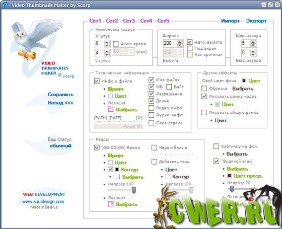 Video Thumbnails Maker - это программа, которая позволяет снимать "превью" с видеофайлов. Утилита имеет широкий диапазон настроек. Поддерживается пакетное снятие превьюшек, раскадровка, водяные знаки, обрезка углов кадров, рамки, тени, альфа-каналы, штамповка времени в кадрах, добавление информации о видео, настраиваемые прозрачность, цвета и шрифты. Поддерживаемые форматы видео? Любые, для которых есть подходящие кодеки (читайте, любые, которые воспроизводятся в BSPlayer-e, Windows Media Player-e, ...). Для работы программы необходим Microsoft .NET 2.0.
