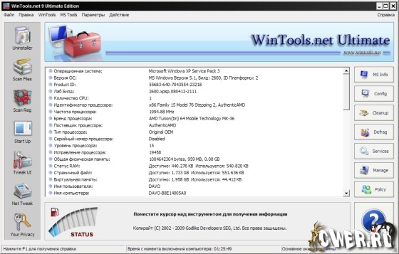 WinTools.net Ultimate – набор инструментов для оптимизации операционной системы Windows. В состав программы входят компоненты для полного удаления нежелательных программ и «мертвых» ссылок реестра, а также для контроля процессов, настройки системы, интернет-соединений и интерфейса. Кроме того, имеются утилиты для надежного хранения конфиденциальной информации. Работает на платформах Windows 2000, 2003, XP и Vista.