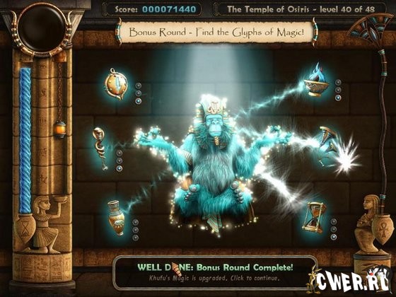 Каждую тысячу лет таинственный туман окутывает древнюю пирамиду Саккары. Только члены секретного ордена знают, что дневной свет, которого лишаются смертные в это время, нужен глубоко под песками пустыни - в давно забытом месте, где покоятся древние легенды. Посетите 7 грандиозных храмов древности и помогите богам восстановить их утраченную силу - в этом вам поможет обезьяна-маг Кхуфу. В игре 7 режимов, более 1000 уровней, 3 уровня сложности, безупречное оформление, качественные спецэффекты и чудесная атмосфера древности.