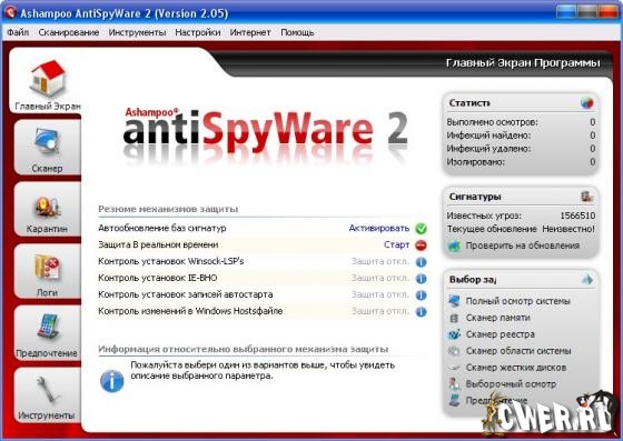 Ashampoo AntiSpyWare - антишпионская программа, которая внимательно следит за всем происходящим в системе (даже самой Windows приходится просить разрешения внести в себя изменения), тем самым не позволяя пробраться в компьютер ни одной "шпионской" программе - всевозможным spyware, троянам, перехватчикам клавиатурного ввода, adware и т.п.