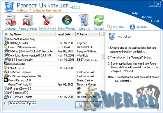 Perfect Uninstaller - отличная программа для полного удаления нежелательных программ, которые нельзя удалить с помощью стандартного диалога удаления и установки программ Windows. С этой программой вы сможете удалять ненужные приложения в вашей системе быстрее и легче. Стандартный диалог установки и удаления программ часто не может удалить определенные приложения или сломанные ключи реестра, в отличие от данной утилиты, программа не только позволит вам удалить приложения, но и очистит ваш ПК от поврежденных записей в системном реестре, улучшая производительность и скорость вашей системы. Кроме того, с помощью этого приложения вы сможете узнать детальную информацию о том, какие файлы и записи реестра затронула установка той или иной программы. Интерфейс программы прост и легок в использовании.