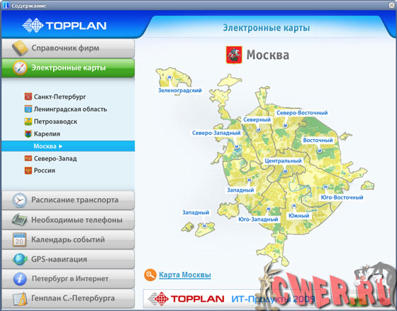 Информационно-справочная система, которая включает в себя актуальный справочник организаций по Санкт-Петербургу, Ленинградской области, Москве, Карелии и Петрозаводску, а также подробные векторные карты Санкт-Петербурга, Ленинградской области, Москвы,Карелии, Петрозаводска, Северо-Западного федерального округа и всей России. Также в системе представлен новый Генеральный план Санкт-Петербурга (2008-2012).