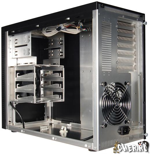 Как утверждают разработчики, нетрадиционное расположение БП улучшает проницаемость для воздуха. Ток воздуха направлен не как обычно – спереди назад – а наоборот. Воздух всасывается задним 12-см вентилятором и выдувается передним системным 12-см вентилятором и вентилятором БП через вентиляционные отверстия по бокам передней панели.