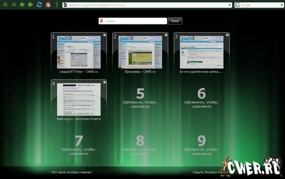 Красивый скин для Opera 9.5 и выше. Опера никогда не выглядела так потрясающе. Светящиеся кнопки, реагирующие на наведение мыши. 11 цветовых схем.