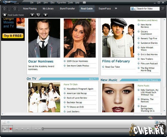 RealPlayer - популярный проигрыватель аудио и видео. Проигрыватель интегрирован с веб-порталом RealNetwork, что позволяет пользователю быть в курсе всех событий, транслируемых через Интернет. Данная программа предназначена для воспроизведения потоковых видео и аудио, постоянно используемых в Сети, а также умеющая работать с QuickTime, Windows Media, MPEG, DVD и VCD файлами.