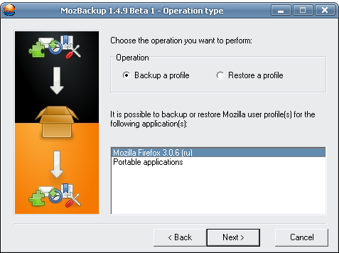 Продолжается тестирование новой версии небольшой утилиты MozBackup. Как понятно из названия, программа предназначена для резервного копирования всех профилей программ Mozilla, а именно Firefox, Mozilla Thunderbird, Mozilla Suite, SeaMonkey, Sunbird и Netscape с Flock. Сохраняет закладки, настройки почты и сами письма, контакты, историю расширения, cookies и кеш.