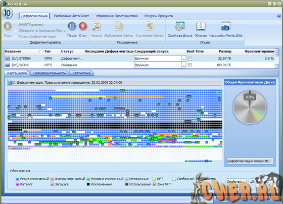 Данные в этой таблице отображаются в виде разноцветных квадратиков, расшифровку цвета которых можно посмотреть в главном окне PerfectDisk. Стоит отметить довольно быструю работу утилиты. Это связано с тем, что используется однопроходный метод дефрагментации с учётом S.M.A.R.T. данных винчестера. Может дефрагментировать не только локальные диски, но и с сетевые, причем в этом случае для облегчения настройки заданий используются профили сетевого планирования дефрагментации и полностью настраиваемое протоколирование работы. Поддерживаются работа с RAID-томами.