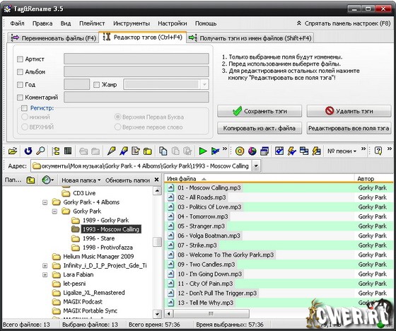 Tag and Rename - программа, предназначенная для ручного управления музыкальными файлами. С помощью данной утилиты Вы сможете быстро и легко переименовать вашу музыкальную коллекцию, используя встроенную информацию в тегах, создавать новые или редактировать существующие теги, а также создавать теги, основанные на именах файлов. Программа поддерживает форматы MP3 (ID3v1, ID3v2.2, ID3v2.3 and ID3v2.4 tags), MusePack mpc/mp+ (APEv1, APEv2 and ID3v1 tags), Windows Media - WMA, ASF и WMV файлы, Ogg Vorbis/Flac/Speex, Apple iTunes и iPod aac (m4a) файлы, включая MP4, M4A и защищенные файлы формата M4P, множество популярных кодеков, включая Monkey’s Audio, Flac, Wav Pack, Optim Frog, True Audio, Apple и Windows Media. В данной программе имеется полная поддержка Юникода. Данная программа обладает многоязычной поддержкой, включая поддержку русского языка.