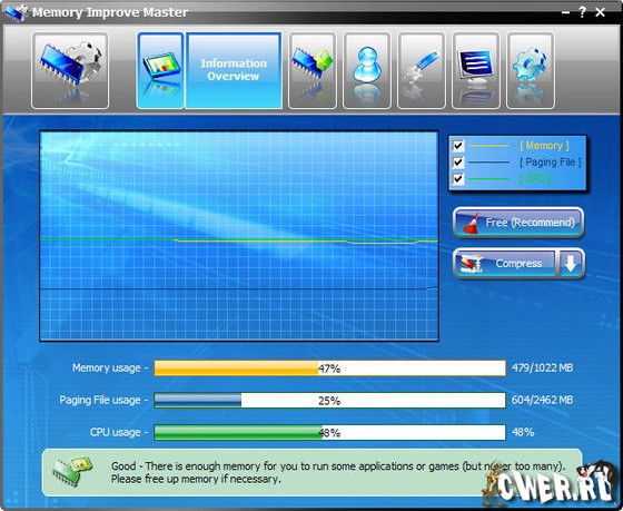 Memory Improve Master – позволяет увеличить быстродействие вашего компьютера за счет освобождения (дефрагментации) оперативной памяти. Имеется возможность установки минимального количество свободной оперативной памяти, при превышении которого запустится модуль и попытается удалить из оперативной памяти лишние процессы. Кроме этого, есть возможность просмотра запущенных процессов, наблюдение за нагрузкой на ЦП и множество других полезных настроек.