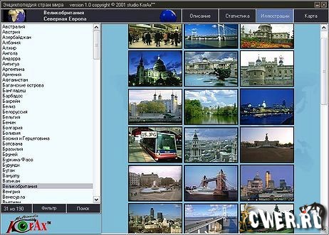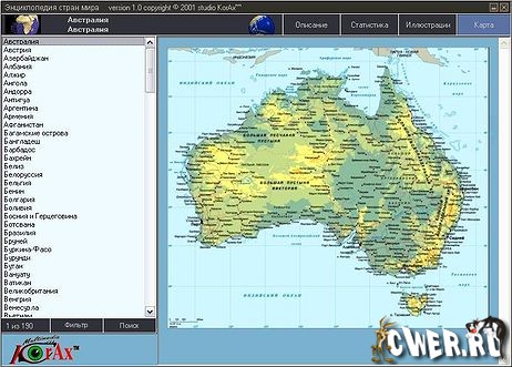 В этой программе собрана структурированная информация о 190 странах мира, разделенная на четыре группы. Для каждой страны составлено описание по географии, экономике, населению и достопримечательностям; таблицы со статистическими данными (плотность населения, протяженность границ, национальная валюта и т.п.); иллюстрации и подробные карты.