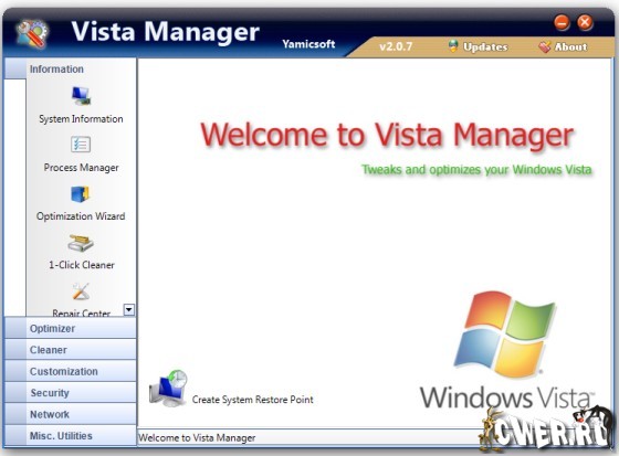 Вышла новая версия программы-оптимизатора для Windows Vista. Она включает более 30 утилит, предназначенных для ускорения работы системы и повышения ее стабильности и безопасности. Программа выдает подробную информацию обо всех компонентах компьютера и о запущенных процессах. С помощью Vista Manager можно ускорить запуск и завершение работы системы, произвести поиск ненужных и дублирующихся файлов и удалять их, исправить ошибки в реестре, провести дефрагментацию реестра, отключить системные обновления и отчеты об ошибках. Кроме этого, доступно множество операций, связанных с настройкой внешнего вида системы: можно изменить содержание контекстных меню, настроить оповещающие сообщения, задать автоматическую смену обоев. Оптимизирует работу с сетью.