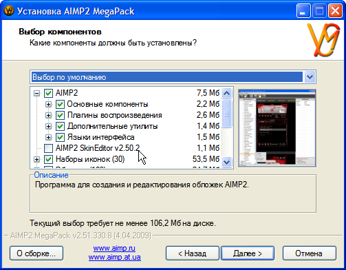 • Компоненты, входящие в официальный инсталлятор AIMP2.