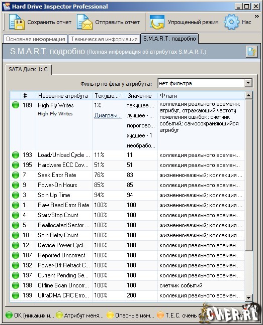 Современные жесткие диски поддерживают технологию S.M.A.R.T. (Self-Monitoring, Analysis, and Reporting Technology), которая была специально разработана для обнаружения грядущих выходов дисков из строя. Используя эту технологию, Hard Drive Inspector может осуществлять наблюдение за текущим состоянием различных жизненно-важных параметров, описывающих надежность и производительность диска. Hard Drive Inspector анализирует эти данные и предупреждает пользователя в том случае, когда параметры указывают на критическое падение надежности винчестера. Это во многих случаях позволяет предотвратить потерю информации.