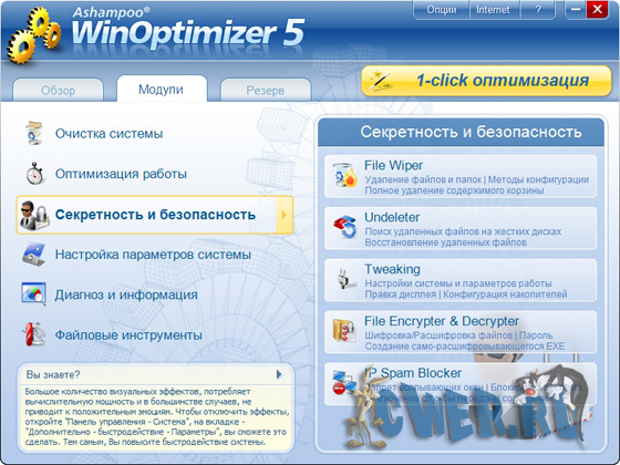 Удобное меню представляет отдельные блоки Ashampoo WinOptimizer 5 и дает возможность измерять мощность системы, отключать раздражающие сообщения при автозапуске, или уничтожать ненужные файлы, и все это - одним нажатием клавиши.