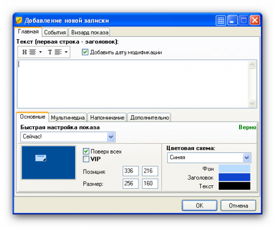 • customizing the default parameters of notes (their size; header and text alignment; text, background and title color; position on the desktop; transparency; the date and time of reminding; shortcuts);
