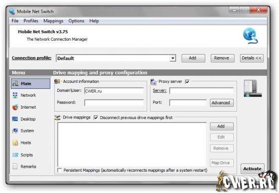 Windows слабо приспособлена для работы с несколькими сетевыми подключениями одновременно, и необходимость менять опции интернет-соединения вручную каждый раз, когда вы хотите перейти с локальной сети на ADSL-модем, мягко говоря, неудобно. Еще хуже обстоят дела у мобильных пользователей, которые постоянно в движении и вынуждены заново настраивать параметры подключения к интернету, sharing и т.д. на каждом новом месте. Mobile Net Switch позволит с легкостью избавиться от всех этих неудобств. Программа умеет работать с неограниченным числом интернет-профилей и мгновенно переключаться между ними без перезагрузки ПК. Остается только внести необходимые данные (IP-адрес вашего ПК, интернет-шлюз, координаты DNS-серверов и т. д.) для каждого из профилей и навсегда забыть о подобных проблемах.