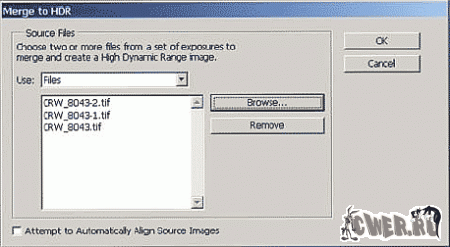На открывшейся вкладке выбираем нужные нам файлы. Если мы используем не проявку RAW формата, а реальный брекетинг, то необходимо поставить «галочку» в левом нижнем окне « Attempt to Automatically Align Source Images» - Автоматически выровнять источники изображения. Это необходимо для выравнивания кадров, особенно если съемка проводилась «с рук» без штатива. Нажимаем ОК и…